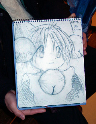 午後4時半頃、ゲーマーズ博多店にて待ち合わせ中、携帯電話が鳴り「どこですか」と。…あれ?私の目の前に居る人も携帯電話をかけてる…あっ!…ということで、やや衝撃的な初対面をしました(謎)。 取りあえずへろりと挨拶をして、プレゼントでも。私は年賀状を。…う〜ん、私の絵じゃ、お年玉年賀はがき分の価値しかありませんね…。南郷さんは…これは!?「岡山名物きびだんご」!?こっちに来られる前に岡山に立ち寄ったのだそうです。よーし、これで動物とかを家来にするぞ!(それはドラえもんの「桃太郎印のきびだんご」) さて、私は普段会わない人に会うと途端に多弁になる傾向、というか癖がありまして…、今回もやはりなんかやたらしゃべってました。言わんでもいいことを何度か口走ったような気がします、…ひ〜。 と、南郷さん、1冊のノートを取り出して…わぁコクヨの「Canpus」のB罫だ〜、私も使ってる〜、…じゃなくて…、おわっこれは日向たかひろさんのお絵描きノートではありませんかっっ!凄いですっ。…いや私はめちゃめちゃ日向氏を尊敬してますよ。猫耳を描くならば必ずと言っていいほど参考にしておりますし、このサイトのデザインもたかひろさんのトコを参考にしたものなんですよ〜。 ……ふえ〜。堪能させていただきました。なんか、書き直した跡があまり見られないというか、相当にすらすら〜と書かれた雰囲気ですね。凄いですナリ〜。 その後、スケブ描きを頼まれたので、頑張って描きました…。私としては非常に速い速度で集中して描き、しかも比較的出来がいいものになった…と思うのですが、どうでしょうか? さて、そろそろタイムアップ。帰る前にメイドさんなコスチュームの豚カツ屋「浜勝」をお見せしたかったのですが、曖昧な記憶を頼りすぎて失敗。今後の課題にしときます(笑)。 よせばいいのに空港まで見送りに行き、福岡土産に「筑紫もち」を勧めてきました。さらに最後までマシンガントークを続け、南郷さんを困らせてしまいました。…いや、話し出すと本当に歯止めが効かないんですよ。今後は気を付けます…。