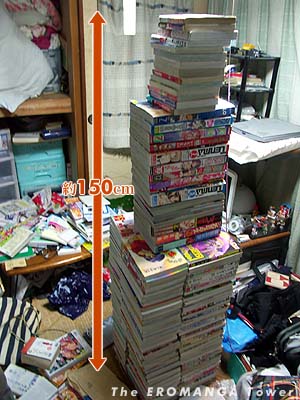 残りは各1冊〜 フランス書院・龍炎狼牙「魂の鎖」 るーえんろーが先生はどんどん凄い方向に向かわれてらっしゃる気が…。 心交社・なぎさわゆう「ぷちきゅん」 ねこみみ巫女萌え。そういやアダルトでねこみみ漫画って割と少ないですねぇ…。まぁ私の中ではえびふらい先生の「夢で逢えたら」が最高峰であり越えられない壁なんですが…。 一水社・アンソロ「イケナイ少年遊戯」 だからアンソロは…一言書き辛い。っつーか私こんなにショタアンソロばっかり買ってたのですか…。 司書房・マーシーラビット「MERCY'S FILE」 いいなぁこの90年代初頭な絵柄。心が落ち着くよ…(2度目)。 マイクロマガジン社・猫玄「夢を見ようよ。」 猫玄先生の漫画はイイ。そして作中に携帯電話が出て来ないストーリーもいい。カムバック90年代〜。 エロ漫画はこんな感じです〜。我ながらマニアックすぎるラインナップ。なんつーか、一人の趣味で買ったとは思えないようなラインナップです…。えええとベスト3は1位-的良みらん「Angelical Pendulum」、2位-長月みそか「あ でい いんざ らいふ」、3位-しのざき嶺「Camp♥Mission」…こんな感じです。アダルトでも割とストーリーがしっかりしてるのが好きなんです。的良みらん先生とか超オススメ。キャラクターをものすげぇ愛して描かれてらっしゃるのがズガンズガン伝わってくるのです。…しのざき嶺先生も私は大好きですけど、素人が手を出すと人生が変わっちゃう恐れがあるのでお薦めはいたしません…w。 | ◆ お ま け 。 つくってみたはいいけれど、あまりの恐ろしさ(とネタの寒さ)に公開するのをためらっていたエロマンガ塔・2004年夏バージョン。 最下層は4冊一組で80cmの高さなので、もし全部まっすぐに積み上げられたとしたら、4メートル弱(390cm)の高さに達するはず…。 | ○その他(画集とか) - 5冊 メディアワークス - 3冊 ・おかゆまさき「撲殺天使ドクロちゃん」 …怖いもの見たさで買ってみました…。結果→ぴぴるぴるぴるぴぴるぴ〜♪ ・ごとP「なごみ日和 ごとPアートワークス2」 殺伐とした心を落ち着ける為に。 ・高野音彦「高野音彦画集 river's end」 見ていると、ざわざわ、ざわざわと胸の中が動き出すのです。 エニックス - 1冊 ・駒都えーじ「蒼い海のトリスティア イラスト&設定資料集」 ぱ ん つ は い て な い ! 芳文社 - 1冊 ・海藍「トリコロプレミアム」 登場人物の複雑怪奇な髪型が分かるかもしれない一冊。 …ってなわけで、総計54冊と相成りました。冊数少ないのに変な本多過ぎです。ちなみにエロゲは1本も買って無いはずです。夜のおかずは基本的に漫画と妄想を駆使する派なのです。