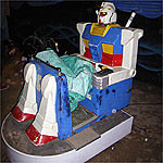 | ■9月18日(日) | ●恐ろしいくらい昔のままで。 この時期の福岡の祭りといえば放生会。というワケで筥崎宮にいって参りました。駅からバスに乗って、大博通りから明治通りに入って県庁方面へ。昔は路面電車の線路だったバス専用道に入ってしばらく行くと、西鉄の昔のマークのままの標柱が残る箱崎バス停に到着。 参道から左に折れて、お化け屋敷の方へ向かうと、あの名調子が聞こえてきます。この一帯はホントに昔のままの縁日が残っていて、射的・ひよこつり・ピンボ−ルなどが目白押し。極めつけは見世物小屋で、あのひたすら怪しげな雰囲気は健在。 そしてその横には仮設の遊園地があるのですが、これまた凄い。写真のガンダムの遊具なんかいつから使ってんだな感じで年期入ってるし、私が幼稚園か小学校の頃に乗った記憶のある「20世紀的21世紀未来観デザイン」のロケットもそのまま。先日東海道から引退した新幹線100系だってここでは現役(しかもJRマークとNS=NewShinkansenマークが両方付いている)! …ピンボールのコーナーをぼけっと眺めていると、横のカップルの男性がカメラを構えて…!!ニコンFEだ!その自然な使いこなしを見ていると、ホントにタイムスリップしてしまったのかと思うのでありました。