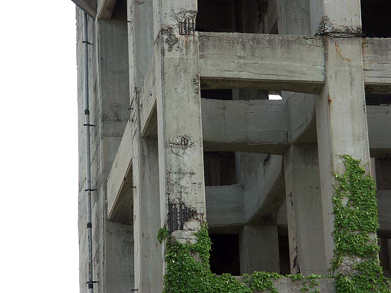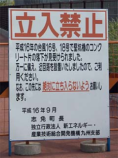 あの時載せた写真は5月下旬に立ち寄った時の写真なのですが、その時撮った他の写真を載せてみますね。 例えば立坑櫓の近くを通るジョギングコースには右のような看板がたっていたりします。そして実際にコース上には幾つかのコンクリート片が落ちているのが見えました。 まぁこれに関しては立坑櫓にあまりにも近い位置にコースが設定されていたと言う事の方が問題という気もしますが…。 |  (画像をクリックで拡大写真) | 例えばこうやって部分を見ると、かなり大きくコンクリートが剥がれ落ちて鉄骨がむき出しになっているのが分かります。こういった部分を補修する事が出来なければ崩落は更に進み、本当に倒壊する可能性は大いにあります。 鉄道車輌なんかもそうですが、こういった産業遺産は人手やカネをかけなければ保存が難しいんだろうな…なんて思います。 ちなみにこちらのページ〔みに・ミーの部屋さん〕に他の部分のクローズアップが数多く載っていますのであわせて紹介しておきます。 |
