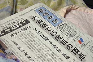 | ■3月10日(金) 鈴仙・優曇華院・イナバウアー | ●D.Naの手紙。 「あなたの新聞『長崎新聞 2006年2月20日号』を受け取りました。そこに書かれている路線バスの旅のことを知り、喜んでいます。そこで私の心に生まれた考えを聞いていただきたくなりました。それは、『バス旅』と呼ばれていることは、愛の法則に他ならないということです。愛は人間の生活の最高にして唯一の法則であり…」 …なに「トルストイの手紙」をもじって遊んでますか私。ってかNHKの映像の世紀観た人じゃ無いとわからんネタだし愛の法則とかそのままでイミフメイだし。 |  | ま、そんなわけで件の長崎新聞を取り寄せてみました。記事自体は長崎新聞さんの公式サイトの「フリースタイル」のコーナー(トップから左下らへんをクリック、直リンク禁止のようなので…)に載ってますけど、やっぱり紙面で読みたかったので。 あと、普段読まない新聞はいろいろ楽しめるのです。西日本新聞と比較して細い書体が活字なのでぱっと見て紙面の色合いが「薄い」感じとか(実は西日本の方が全国的に見て例外的に太い)、紙面全体が紙に対して「上寄り」になってる所とか(記事を囲む長方形を紙の中央に持ってきて、日付欄がその上にある。西日本は日付欄も含めて紙の中央にある)。 面白いのはやっぱりラテ欄。テレビ欄がNHKの次にNCCになってるのはやっぱり本社が隣にあるほどの関係の深さからでしょうね(西日本新聞もNHKの隣はTNC、TVQと続く)。 第2テレビ・ラジオ欄はもっと面白くて、テレビ・ラジオ共に熊本と福岡の局が載っています。 …久々に電波ネタやったような気がする…。