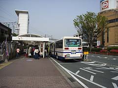 さて、折尾駅東口から左側を見ると、北九州市営バスの乗り場が。そう、芦屋は北九州市では無いのですが市営バスが乗り入れているのです。 しばらく待って、やってきたバスの行先表示に「芦屋」の表示があるのを確認して乗車、レッツゴー。 |