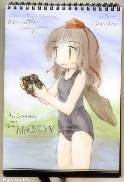 ●久しぶりに落描き。 …ホントはCGの案としてのラフだったんですけど、なんだか時期を完全に逃しちゃったのでこのまま載せようかな、と。 折角なのでぺインタークラシックでちゃちゃっと色塗ってみました。 |  | スク水ー。ニコノスVー。あやっちー。 …なんだかアレゲな取り合わせですが、こうなった過程を説明いたしますと、夏が終わる前にスク水描きたいよね→水着ってっと濡れ場ですな(違)→こういう過酷な環境には水中カメラだっ(何故)→カメラ持ってて絵になるキャラは射命丸文だよね、ってな具合であります。前も書いたけど私の中では文はカメラ好きなんですってばっ。 この絵を描いてる時に丁度、博多デイトスのキタムラさんにニコノスV(中古)が展示されておりましていろいろと役立ちました。カッコイイカメラでしたよっ。このカメラはプロユースとしては珍しくオレンジという鮮やかな色なので画面上で映えますな…まぁ例によって私の描き方はかなりテキトーなんですけどね。 ああ…今年はスク水は落描きだけでおしまいかなぁ…。