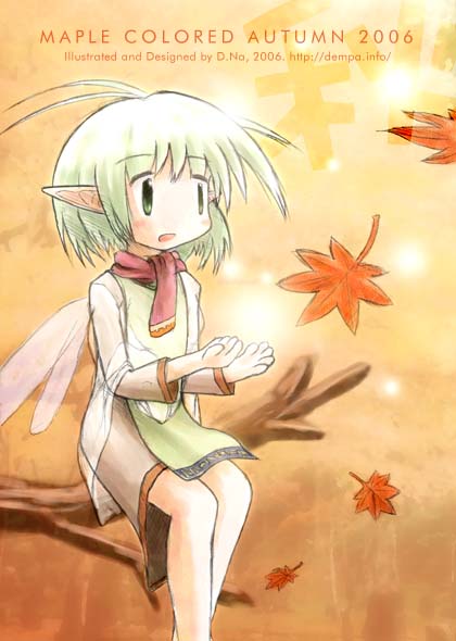 ●久しぶりに気合入れてイラストを。 描く度に「久しぶり」言ってる気もしますけど…。 |  | 秋ということで紅葉。今年の正月に思いっきり寒そうな恰好をさせた妖精さんを、このままじゃ可哀相、というわけでちょっとは暖かそうな恰好にさせてみました。 私が気合入れて絵を描く時は大概イベントで知り合いの方にお会いする時なんですが、初夏や秋のイベントは時候の挨拶が無くていつもデザインに困ります。…なのでこれは以前の秋バージョンの使いまわしです(ォィ)。