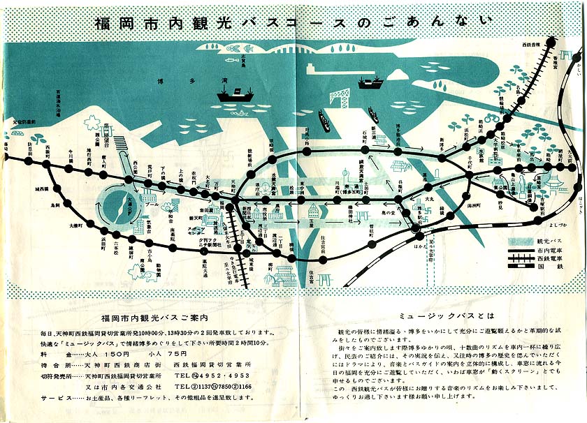 | 表紙を開くといきなり福岡市内観光バスのコース図見開きが載っていて面喰らいます。もちろん路面電車は健在、博多駅は旧駅。料金は大人150円。 |