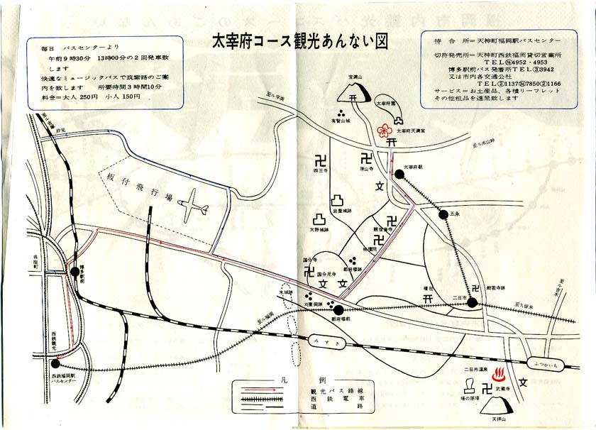 | 見開きの裏側にはちゃんと太宰府のコース図が載っています。料金は大人250円。図で目を引くのは、板付飛行場(福岡空港)への引込線がわざわざ描かれていること。まるで空港連絡鉄道のようです…ってか線路が残ってたらホントに連絡鉄道として役立ってただろうになぁ、勿体無い。 |
