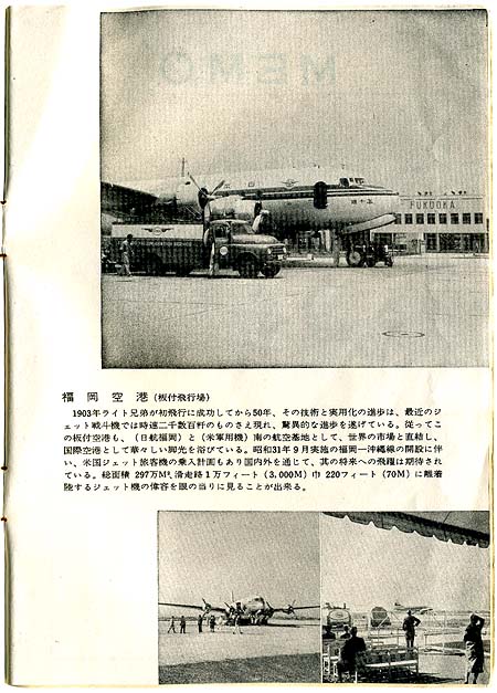 太宰府の観光案内は飛ばして(ォィ)、福岡空港の紹介ページを。 「1903年ライト兄弟が初飛行に成功してから50年、その技術と実用化の進歩は、最近のジェット戦斗機では時速二千数百粁のものさえ現れ、驚異的な進歩を遂げている。」の文章はなかなか素晴らしいです。きっと観光バスで見物することは出来ても、乗れる人はあまり居なかったんでしょうなぁ。 文章でやたらジェット機のことを言ってるのに載ってる写真がプロペラ機だけなのは御愛嬌。 |