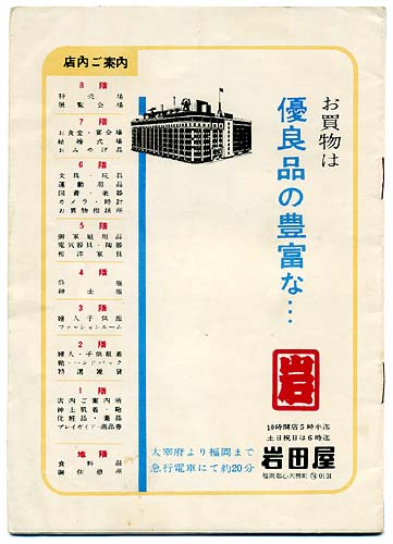 裏表紙は岩田屋の広告。 「太宰府より福岡まで急行電車にて約20分」という文は説明を要するでしょう。これは列車種別の「急行」ではありません。かつての福岡においては、現代における「路面電車」を単に「電車」と呼び(これは他都市でもよくあった)、その「電車」より早いスピードで走る西鉄大牟田線のことを「急行電車」と呼んでいたのです。