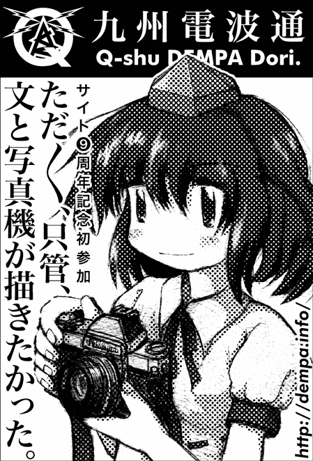 ●新企画のお知らせです。 上で放置企画を嘆いているのに新企画。やりたい事があると勢いで実行しちゃうのは、癖みたいなものでして。 で、今回は何をヤラカスのかといいますと…。 |  | 11月30日(日)福岡市中央区は都久志会館にて開催される「tenjin.be #04」にサークル参加致します。同人イベントに自らサークル参加するのは初めてです。そして漫画を描くのも数年ぶり。 上に掲載しましたサークルカットをご覧になりますとお判りでしょうが、ジャンルは東方Project。内容は…えー、「自分が欲しいもの」の自給自足ですハイ。以前から射命丸文+カメラ本無いのか等と書いておりましたけれども、ふと「無いものは自分で」の精神を忘れちゃあオタク失格だなと思いまして今回の参加と相成りました。 どこまで自分の望むものに近づけるか、開催日まで出来るだけ頑張ってみます。当日ご来場の方、お暇でしたらお立ち寄り下さいませー。