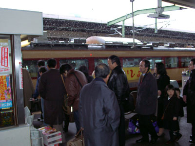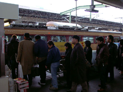雪の関係か、非常に乗客が多かったです。この混雑ぶりに、国鉄色、しかも雪。…まるで東北特急のようでした。