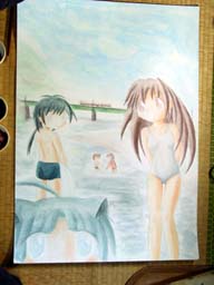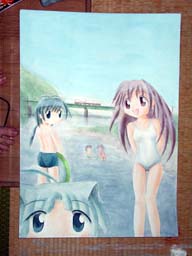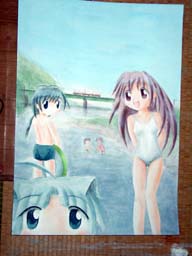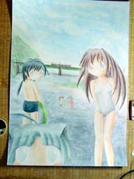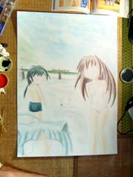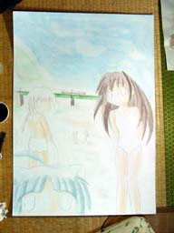| こうやって解説を書くよりも写真を見た方が一目瞭然かと思いますが…、一気に色を塗ってしまうのでは無く、薄い色を何度も重ね塗りしています。乾燥させる時間を節約するためにドライヤーを頻繁に使いました…と人に言うと「紙がごわごわにならなかった?」と尋ねられるんですが、私がやった限りでは問題は発生しませんでした。むしろ乾かす間に絵の具があらぬ方向に垂れていってしまうということを避けられたメリットの方が大きかったです。 キャラクターの瞳はいつも最後の方で塗ることにしています。ここを先に塗ってしまうと自分の場合、他の部分がおろそかになってしまいがちなんです。「画龍点睛」という言葉もあることですし(笑)。 ちなみにこの3枚の写真の時点で〆切をぶっちぎってます…(汗)。結局〆切2日遅れで直接開校記念祭の展示場所にもっていくことになりました…。 | |