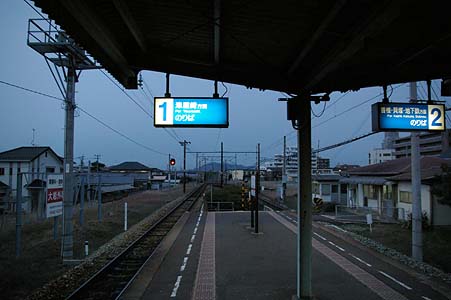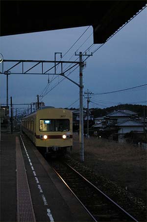 出札口で駅員さんに「津屋崎まで1枚」と告げて切符を購入。この一昔前まで当たり前だった切符売場の光景も、今ではかえって珍しいものになってしまった。構内踏切を渡ってホーム上に上がると、駅周辺に広大な空地があるのに気が付いた。恐らく貨物営業のあった頃の名残だろう、いまでは荒れ放題になっている。やってきた電車は300形。ラッシュ時だけ運行される3輛編成である。車体に備え付けられたベルを鳴らして発車。車内は立客はなく、かといってガラガラでもない。バス1台には収まりそうにない乗客数なのだが、バス移行になる4月以降はどうなるのだろうか。 とはいえ途中駅で乗客は降りてゆき、「心の旅」が流れて津屋崎駅に着く頃にはすっかりガラガラになっていた。 |