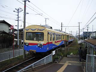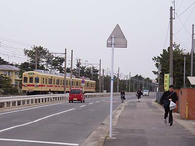 新宮駅に到着してみれば、なにやら工事中。廃止以降はここでバスと接続するとのことで、それに対応する工事だろう。![]() ここ新宮駅は新宮高校の最寄り駅。最寄りといっても駅までは多少の距離があり、在校生はこの道を「新宮ロード」と呼んでいるとか。 貝塚行き電車がスピードを落として駅へ入って行く。学生達はそれに乗り遅れないようにとしばしの「併走」を。…離合待ちで間に合ったようだね。 |