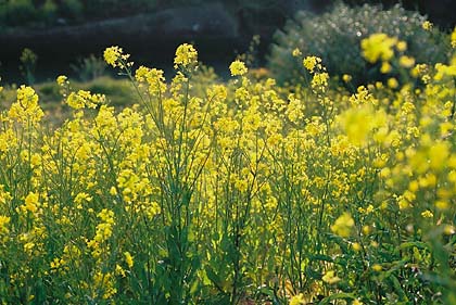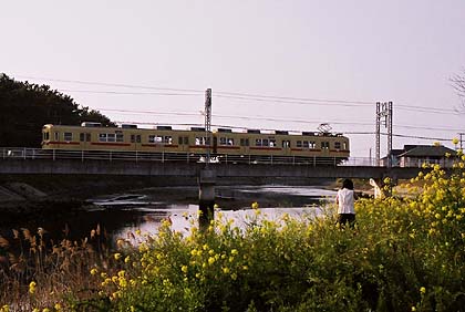 ![]() 線路沿いに歩いて行くと、菜の花が咲き誇る川を見つけた。この鮮やかな黄色を宮地岳線と絡めて撮ろうと試行錯誤したけれども、結果はいまいち。 右の写真に写っている方は、私と同じく宮地岳線を撮りに来られた模様。 |