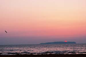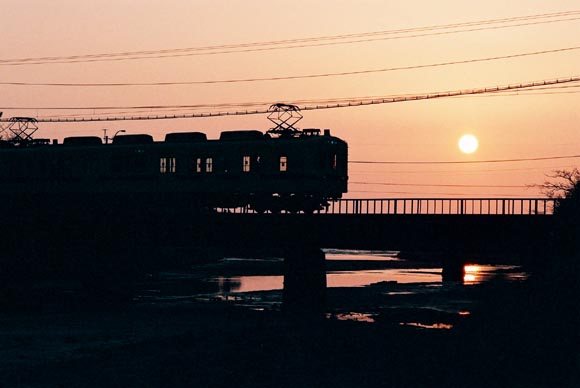 福間駅南側の西郷川にかかる鉄橋、玄界灘に太陽が沈む頃。夕陽を浴びて、宮地岳線の電車がシルエットとして浮かび上がる… 私には珍しく、イメージ通り。以前夕刻にここを通った時思い付いたことをギリギリで果たすことが出来た。 太陽はちょうど相島へと沈んでゆく。その光景を福間の浜からずっと眺めていた。 |