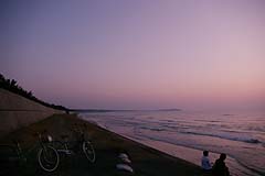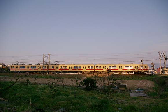 | ラッシュ時運用のこの編成も、終点近くでは持て余し気味。 ところでこの周辺では、不思議な音がしている。…走っている姿は無いのに、遠くから電車の走る音がずっと聞こえてくるのだ。 最初はJRの電車の音が聞こえているのかと思ったが、違う。いくらJRだからといってこんなに列車は走っていない。気になって発生源を調べてみると、それはなんと海だった。波の音が松原を抜けて低い音だけが残り、電車の音のようになっているのである。 そんなわけで、また海岸へ出てしまう。日没後の残照が美しかった。 ![]() そんなことをしているので花見駅に着く頃にはあたりはすっかり暗くなっていた。このあたりの住宅街は街灯も少なく、暗い。 ここから再び電車に乗って、ゴルフ場前駅へ。 |