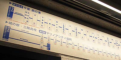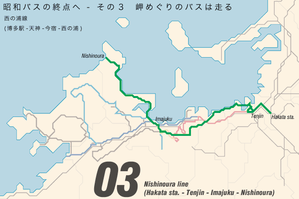 ■西の浦線 (博多駅-天神-都市高速-今宿-西の浦 乗車時間1時間13分) その1のときと同じく、博多駅交通センター3階の32番のりば。今回はここから西の浦線に乗ることにする。 この路線は、博多駅、天神から都市高速経由して今宿に至り、そこから博多湾沿いに走って西区西浦へ至る路線である。この路線は11月以降は今宿までの区間が廃止され、九大学研都市駅始発の路線となる。 この路線と、その1でレポートした下山門線の廃止をもって、福岡都心に乗り入れる昭和バスの一般路線はほぼ全て無くなる(休日2往復のみ運行される直通のマリノアシティ線は存続)。昭和バスの存在が完全に「ヨソのもの」になろうとしているのだ。 | |||