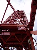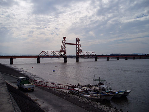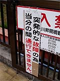 | ガーン。せっかく来てみたのに…まぁでもそれもまたよし。橋の管理室のちっご弁(筑後弁、ね)まるだしのおいちゃん曰く「橋を上下するワイヤーの不具合」とのこと。これだけ古い橋なのでほとんどのメンテナンス部品が特注になってしまうのだそうです。 |