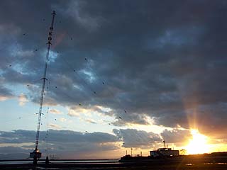 久しぶりにRKBラジオ(RKB毎日放送)の和白送信所に行ってみました。 実は私、ぬるい放送オタクでもあったりするのです。昔は遠距離受信とかよくやってました(まぁアニラジを聴く為だったのですが)。そんな私が最も好きな送信所がここ、和白のラジオ送信所です。何が好きなのかと言いますと、アンテナが干潟上に建っているところ。潮の満ち干によって水上になったり泥の上になったりする、非常に珍しい送信所なのです。 この時は夕暮れ時で干潮の時間。足元を確かめながら干潟の上を歩いて、アンテナの近くへ。この細身の姿とは裏腹に、遠くまで電波が飛んでるんだよなぁなどと感慨にふけってみたり。 そんなうちにアンテナの基部と送信所の局舎の間に夕日が落ちてゆくのを見て撮ったのが一番上の写真。ステキなシルエットになりました。 | |