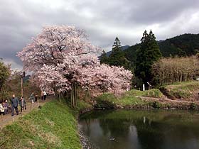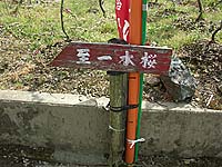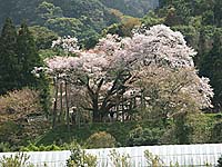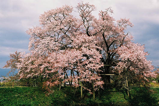 「あそこの十字路で左さ曲がるとばい」 …というわけで、さっきの十字路まで引き返して左へ行くとすぐそこに案内が。なんか今日は無駄足多いなぁ…。 しばらく歩いていくと、中判カメラで何やら撮影してる人が。レンズの先を見てみれば…バカでっかい桜が!これですか、浅井の一本桜というのは。小高い丘に続く農道を。ただでさえ狭い農道なのに、路上駐車の車で更に狭く…みんな、バスとか徒歩とかで来ようよ!(笑) | ||