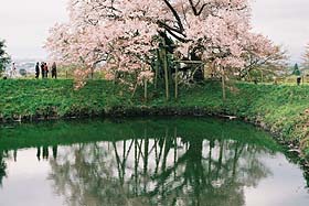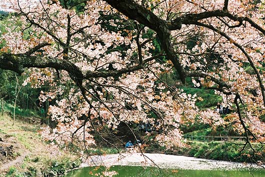 ![]() 池の淵に立つ、ホントにホントに大きな桜の木。今まさに満開といった感じで、まるで雪のように花びらを散らしています。 散った花びらは雪のように融けることは無く水面に浮かび、池の春度を上げ続けています。 | ||