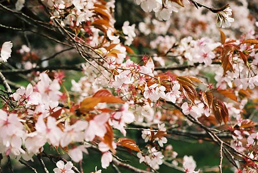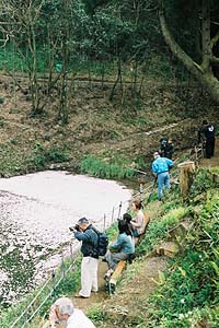 そして池の対岸には、この満開の桜の姿を焼きつけるべくやって来られたカメラマンの方々が。うわ、あれはローライか?ハッセルブラッドか?ぎゃー、NikonのF6なんか遣われてる方も。F6を実際に使用してる風景初めて見たですよ…。まぁ、一番よく見かけたのはEOSデジタルの類でした。それもKissデジタルなんて安物じゃ無くて、20Dとかの中級機以上。1D+Lレンズも見かけた気が…凄いなぁ。 ちなみに…、左の写真で白く見える部分は、湖面の桜の花びらが集まって真っ白になっているのです。う〜ん、チェリーポイントMAX(謎)。 | ||