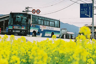 お、あっちからやってくるのは1日2往復しか無い日田バスの朝倉街道−日田・高塚線のバスじゃありませんか。というワケで撮影。 …白状しますとこの写真どうしようも無かったのでトリミングしてます。それでもダメな写真なんですけどね。