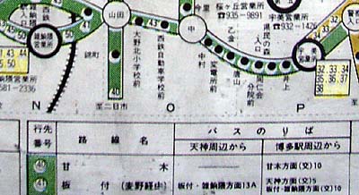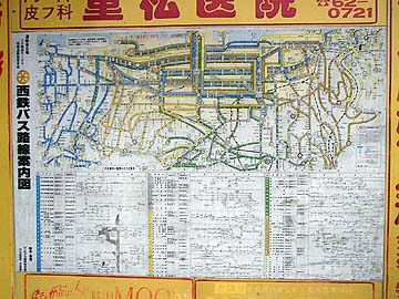 杷木バス停にある西鉄バスの古い路線図。何が凄いってシーサイドももち関連の路線なんかカゲも形も無いし、今は二日市駅始発の甘木方面の[40]番が博多駅から直通してること!そうか…この路線の系統番号は福岡都市圏の系統番号の連番だったんだ…。  ▲クリックで拡大。 |