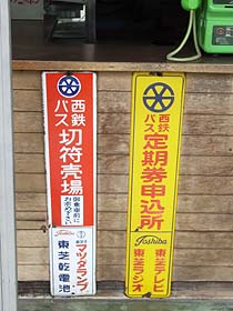 さて、そろそろバスの時間なので戻ることにします。寂れた雰囲気の待合室。おや?なんだあれは…。 ![]() …なんと、西鉄バスは数年前に廃止になったのに、右のような看板が残ってました。しかも旧ロゴ、広告も東芝の旧ロゴとマツダランプというレベルの高さ! この待合室には他にも西鉄バスの路線図が裏返しになってそのままにしてあって、そこからは「行橋」「中津」などの文字も読み取ることが出来ました。…かつては国道10号線を走る長距離路線があったんだなぁ。 |