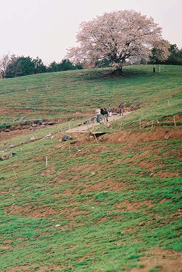でも、道には迷わず行くことが出来ました。何故なら山の斜面に立つ巨大な桜が遠くからもよく見えたからです。一本桜が近くになると、路上駐車の車が沢山。だからみんなバスで来ようよ(笑)。 さて、坂を登っていくといよいよ近くへ。…才尾の一本桜は、牧場内の斜面にある桜でした。 |
