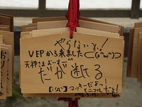 ふと思い立って、太宰府天満宮の菖蒲園に行ってみました。西鉄電車で二日市へ、そこからスイッチバックで太宰府線へ。このミニ路線は私のお気に入りの路線の一つです。 菖蒲園に直行はせずに、まず参拝に。この時はワールドカップにあわせて、御神籤が青一色でありました。 ふとかかってる絵馬に目が。 | ||