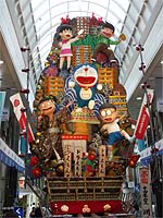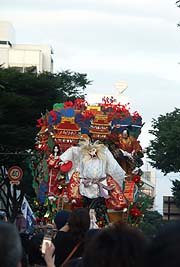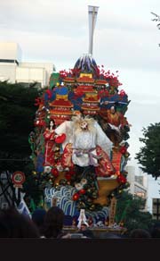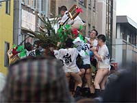 | このような変形を数回繰り返しながら、この山は舁かれています。 ○上川端通コース紹介。 電線の地中化が進んでいる今でも、まだまだ市内には電線が残っている所も多く(変形機能をもってしても路地の低い電線には対応できない)、上川端通は「追い山ならし」「追い山」の全コースを走ることが出来ません。そんなわけで、この山は特別なコースを辿っています。 | |||||||||||||||||||||||||||