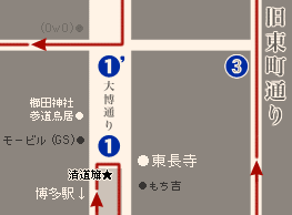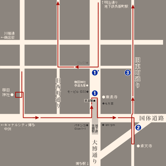 | 慣れた人ならともかく、山笠初心者の方がこんな所に行っちゃダメです。人込みにもみくちゃにされてしまうだけです…。 そんな訳で初心者向けに、博多駅からそんなに遠く無く、かつ山笠の面白みのある場所をピックアップしてみました。地図上の番号に対応して「その(1)」から「その(3)」まで。 ○その(1)…東長寺清道(祇園町交差点周辺)山笠を全く見たことが無い、という人にはここをお薦めします。地図を見れば分かりますが、ここでコースが東長寺の前を通る為に大きくカーブしています。この大迫力ヘアピンカーブがお薦め理由の一つ。そして博多駅から大博通りを真直ぐ行けばこの場所という場所の分かり易さ、大博通り上が交通封鎖されている間は会場が非常に広いこともお薦めの理由です(ただし交通が完全に封鎖されるのは追い山の時のみ)。 さらに地図上の(1)'地点では市内をぐるっと廻ってきた山が狭い道に入っていく姿が見られるという、ひと粒で2度美味しい場所でもあります。 追い山の際は、大博通り上の交通が完全に封鎖されますので広い通り上で見物が可能です。ただし、七番山が通った後に注意が必要です。八番山笠上川端通はここから大博通りを北へ進むので、そのコースを開ける為に観客の大移動が発生します。この大移動の後、巨大な八番山が姿を現わすのです。 ○その(2)…承天寺清道(1)以外の場所で見たいな、なんて思った方はこの周辺がお薦め。国体道路から一旦承天寺の前に立ち寄って、それから同じ道を引き返すという特殊なルートです。また、ここから旧東町通りの狭い道に突っ込んで行くというハラハラドキドキな場所でもあります。 行き方はやはり大博通りを直進して、祇園町交差点で右へ。するとナナメに道が合流してると思いますのでその場所です。 注意点としては、この地図上で斜めに示されている道路は交通封鎖されておらず、山が通らない時は車が通るということです。それから承天寺の前のヘアピンカーブ、この部分は東長寺と違ってかなり狭いのであまりお薦めできません。 ○その(3)…旧東町通り狭い道を驀進する山の姿を見たいと思うならこの場所がお薦めです。(1)の場所からそんなに遠く無いので、途中で場所を変えようかな、という場合にも。 ただし狭い場所なので見物には細心の注意が必要ですし、勢い水がかかることもあるのでそのへんは覚悟して下さい。 ○その他細々とした説明。 追い山ならしは昼間ということで、それほど注意点は無いのですが、追い山は夜中ということでいくつか補足的に説明を…。 一応追い山に合わせて県内各所からの臨時電車・臨時バスが運行されていますが、これらを利用すると到着時刻が追い山開始約30分前と、遅くなってあまりお薦め出来ません。できれば1時間前くらいには見物場所周辺に居る方がいいでしょう。 ですので、終電で博多駅に行って、それからインターネットカフェ等で時間を潰すのをお薦めします。あるいはこの時間のうちに櫛田神社に参拝するのもいいでしょう。追い山前の緊迫した雰囲気は独特のものです。 ちなみに…西鉄電車の終電で天神へ行くというパターンもありますが、一つ問題があります。夜の中洲の街を通り抜けなければならないのです!夜の歓楽街に慣れてる方ならともかく、一般人(?)にはちょっと。私も止むを得ず夜の中洲を通ったことが数回ありますが、毎回イロイロとコワかったです…。 | |||||||||||||||||||||||||||