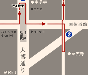 ■「追い山ならし」と「追い山」のオススメ見物スポットの紹介! いつまでだらだらと蘊蓄語ってんだよとお怒りの方、大変お待たせしました…。 先ずは下の地図をご覧下さい。図の真ん中を縦に貫く「大博通り」の下の方が博多駅側となります。赤のラインは追い山ならし、 追い山のコースです。 | |||||||||||||||||||||||||||